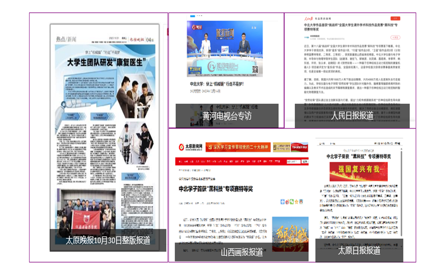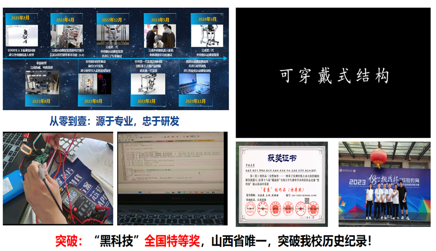 我想成为像南仁东老师那样勇于追求创新的人,大学三年暑假我全程留校,科技创新类赛事共斩获16国奖,尤其是在去年的全国超级赛事“挑战杯”大学生课外学术科技作品竞赛中,我们团队研发的下肢外骨骼康复机器人,获得“黑科技”专项赛星系级作品,即国家特等奖,山西省唯一,突破了我校在该项赛事中的历史记录,我们的参赛事迹也得到了人民日报,黄河电视台等。