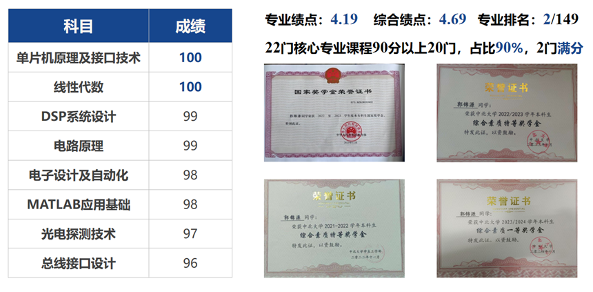我想成为像华罗庚先生那样专注、勤奋的人,作为一名电科专业的学生,22门专业核心课程,20门90分以上,其中两门课程满分,这是对我专业水平的最好证明,去年,我仅作为大三学生便获得国家奖学金,连续两年获得本科生综合素质特等奖学金。