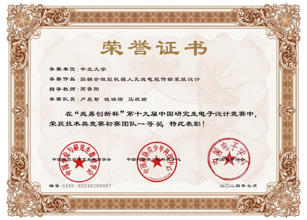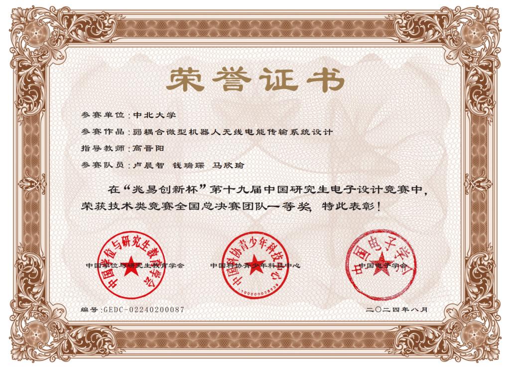 卢晨智,中北大学仪器与电子学院仪器仪表工程专业2023级研究生,曾获得中北大学学业二等奖学金。研究方向为面向胶囊机器人的无线供能技术。研一下学期通过学校和学院相关文件了解到研电赛。经过与导师交流并得到导师支持后,便与团队成员钱瑞琛、马欣瑜积极备赛。团队参赛作品——弱耦合微型机器人无线电能传输系统设计,关注人民生命健康,旨在解决胶囊内镜供能问题的发展痛点,推动我国胃肠微无创诊察发展。在高晋阳导师的指导下,依托课题组多年研究成果,作品形成了具备电磁安全性发射线圈优化模型、具备温升安全性的有限空间接收线圈优化模型和机载新型电能管理电路三大创新点。在山东大学(青岛校区)华北赛区技术赛现场赛阶段,从华北地区48所高校的596支队伍脱颖而出晋级全国总决赛。