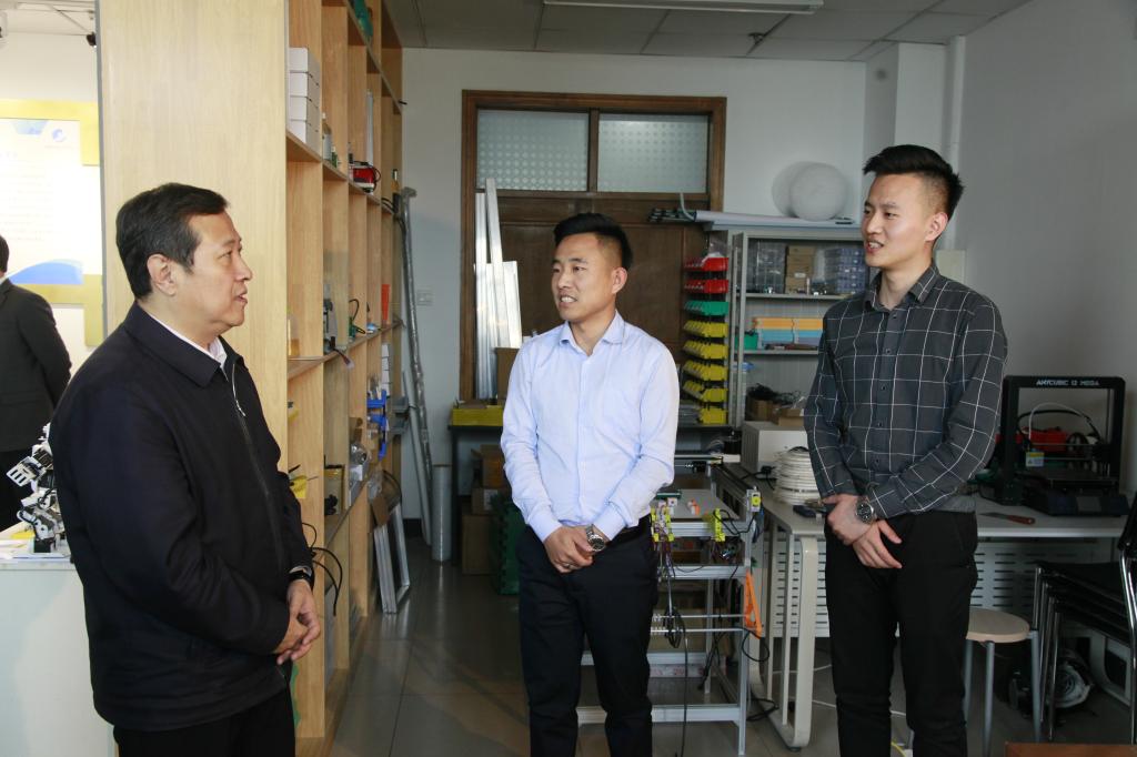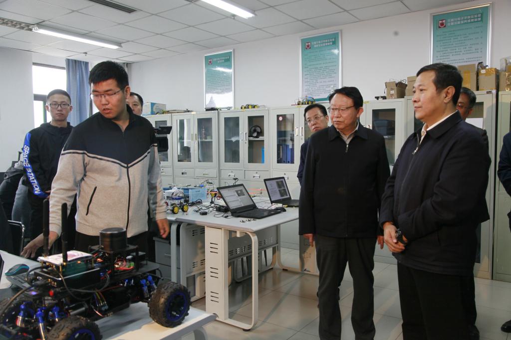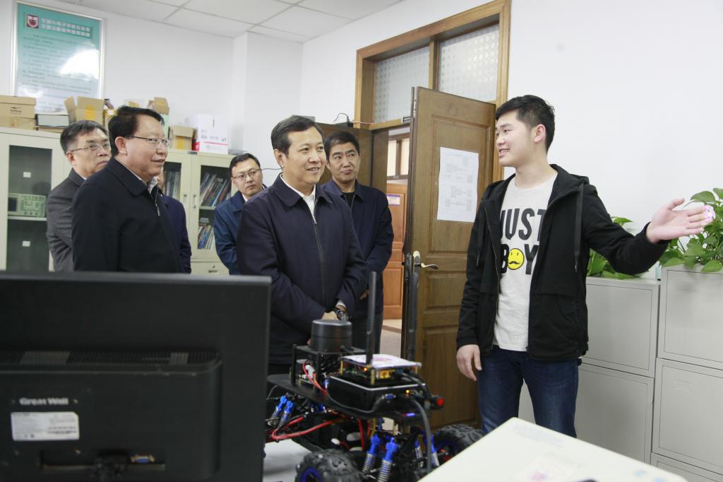 首先,由高宏图书记简单介绍了研究院的发展历史、学生自主管理的运行模式以及近年来的获奖情况。接着,各位领导依次参观了由我院毕业生创办的山西意启创电子科技有限公司、仪器测量实验室和机器人实验室。在参观过程中,学长们对产品和作品做了介绍和简单演示,各位领导对此表现出了极大兴趣并给出了一些中肯建议。