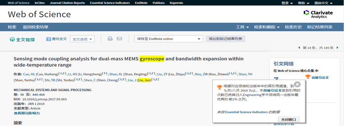 20181127ESI最新数据显示,由我院刘俊教授领衔的抗高过载微机械陀螺仪方向的研究论文《Sensing mode coupling analysis for dual-mass MEMS gyroscope and bandwidth expansion within wide-temperature range》入选工程学领域ESI高被引论文。该论文以青年教师曹慧亮副教授为第一作者(刘俊教授为通信作者)发表于《MECHANICAL SYSTEMS AND SIGNAL PROCESSING》期刊(工程:机械领域一区,TOP期刊,2017年影响因子4.37)上,重点解决了微机械陀螺仪机械灵敏度和带宽之间相互矛盾的问题,为高精度、宽带宽微机械陀螺仪的进一步工程应用提供了支持。