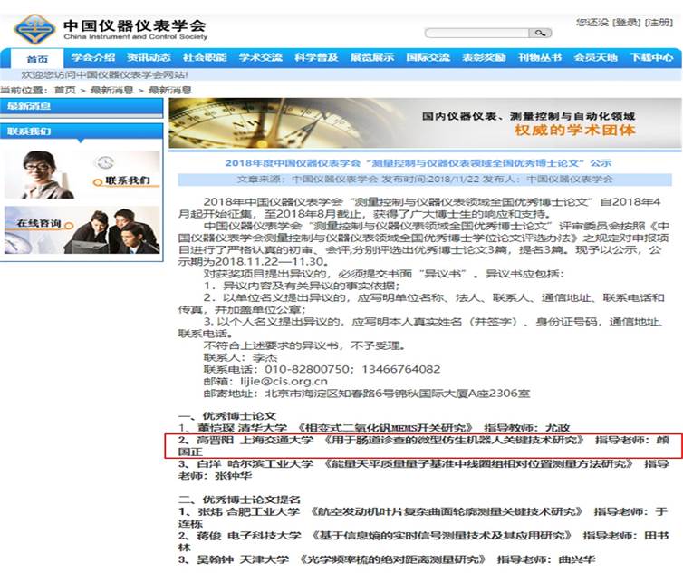 日前,2018年度中国仪器仪表学会测量控制与仪器仪表领域全国优秀博士学位论文评选结果揭晓,经过严格初审、会评,共评选出3篇优秀博士学位论文,我院青年教师高晋阳的博士学位论文《用于肠道诊查的微型仿生机器人关键技术研究》获此殊荣。
