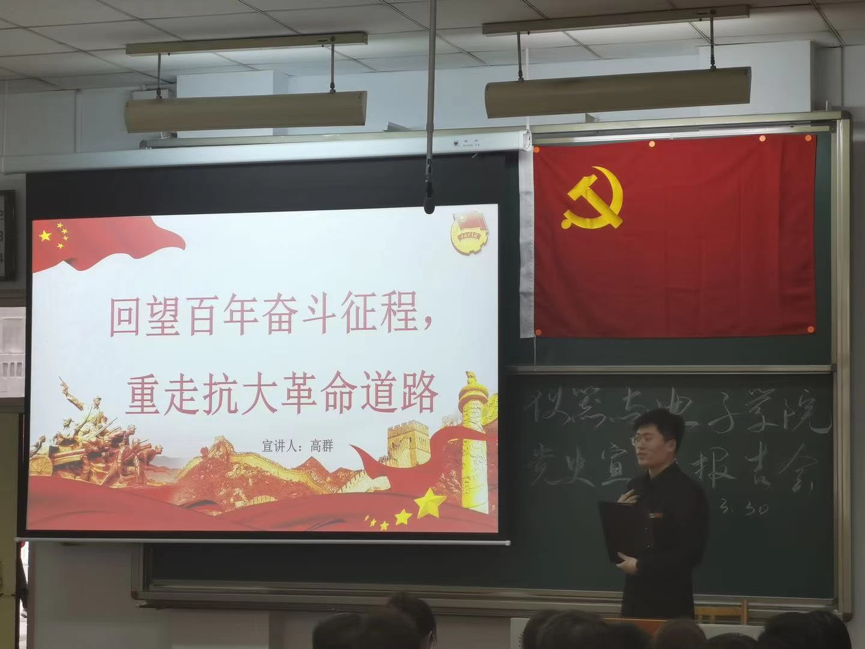 为从党的百年伟大奋斗历程中汲取继续前进的智慧和力量,深入学习贯彻习近平新时代中国特色社会主义思想,仪器与电子学院深入开展党史学习教育。3月30日下午,学院在11206H教室举办专题党史宣讲报告会。邀请学校青春宣讲团宣讲人高群为我院学生党员做了以“回望百年奋斗征程,重走抗大革命道路”为主题的党史宣讲。