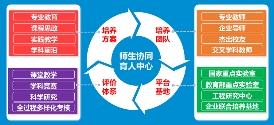 紧密结合科技创新前沿和国家重大战略需求,围绕提高研究生的知识储备、创新能力和前沿问题探索能力,完善覆盖学术型、专业型的培养方案和课程体系。打造了涵盖“专业教育+课程思政+实践教学+学科前沿”的培养方案、“专业教师+交叉学科教师+企业导师+杰出校友”的导师团队、“国家级重点实验室+教育部重点实验室+工程研究中心+企业联合培养基地”的支撑平台、“课堂教学+学科竞赛+科学研究+全过程多样化考核”的评价体系,构建四协同立体式培养体系。