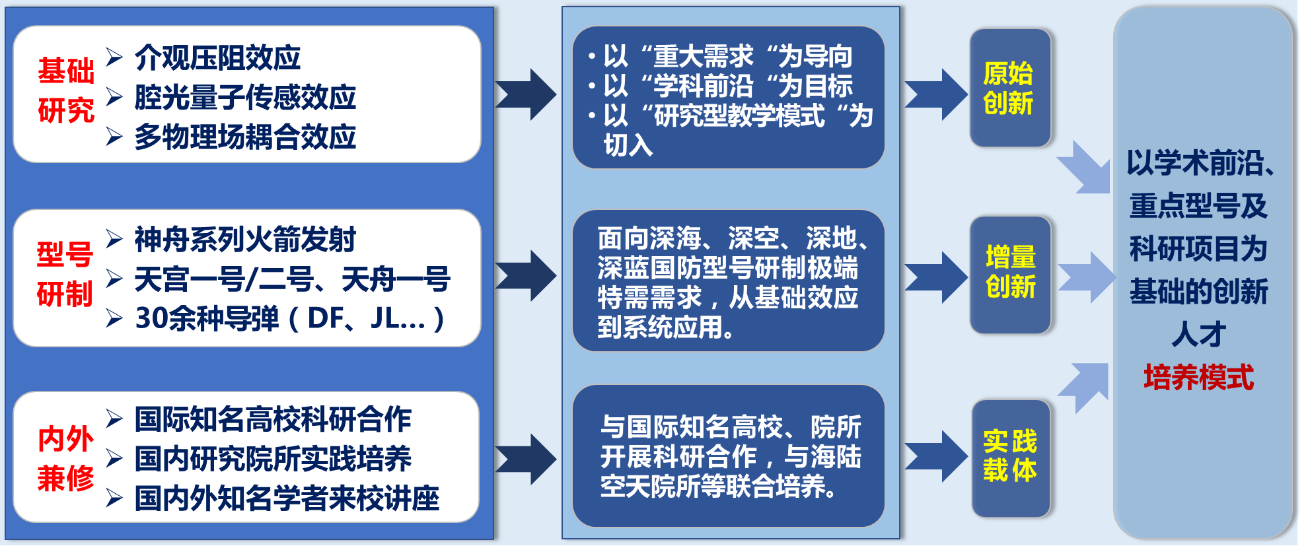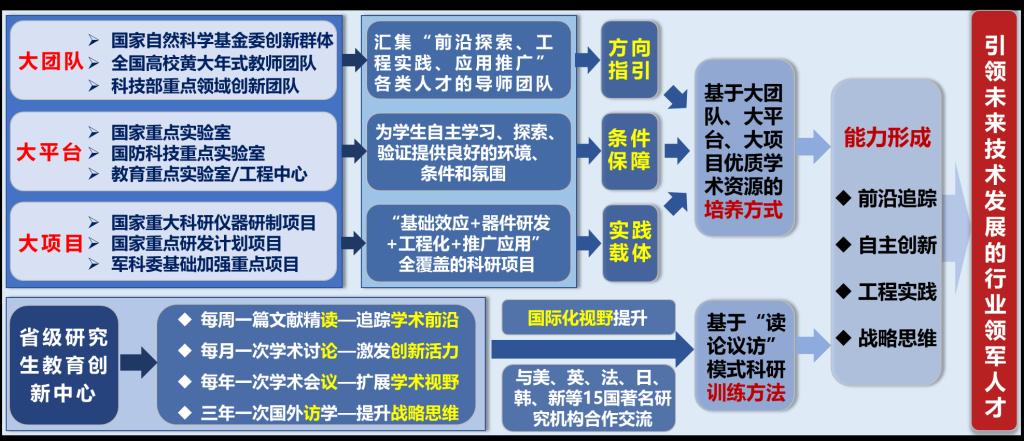 构建基于一流团队作方向指引、一流平台作条件保障、一流项目为实践载体的培养方式。利用大团队集聚“前沿探索、工程实践、应用推广”各类人才导师团队的优势,为学生科研方向选定、科研思维训练提供全方位指引;利用大平台良好的环境、条件、氛围,支撑学生自主完成理论学习、创新探索、实验验证;利用大项目“基础效应+器件研发+工程化+推广应用”全覆盖的特点,使学生全员参与和全面感受科研项目解决全过程。