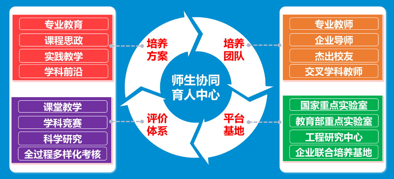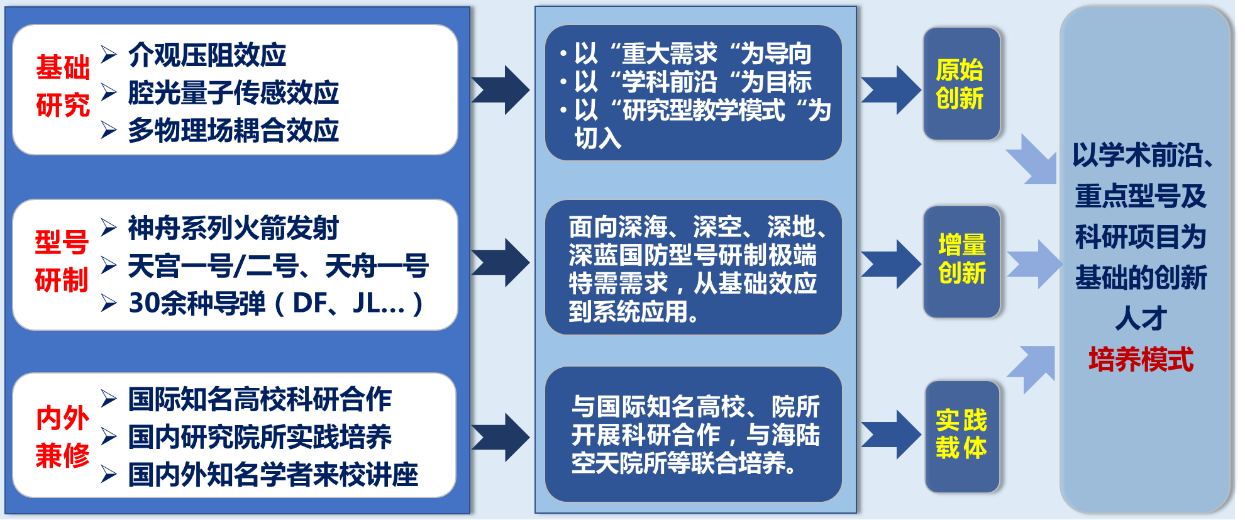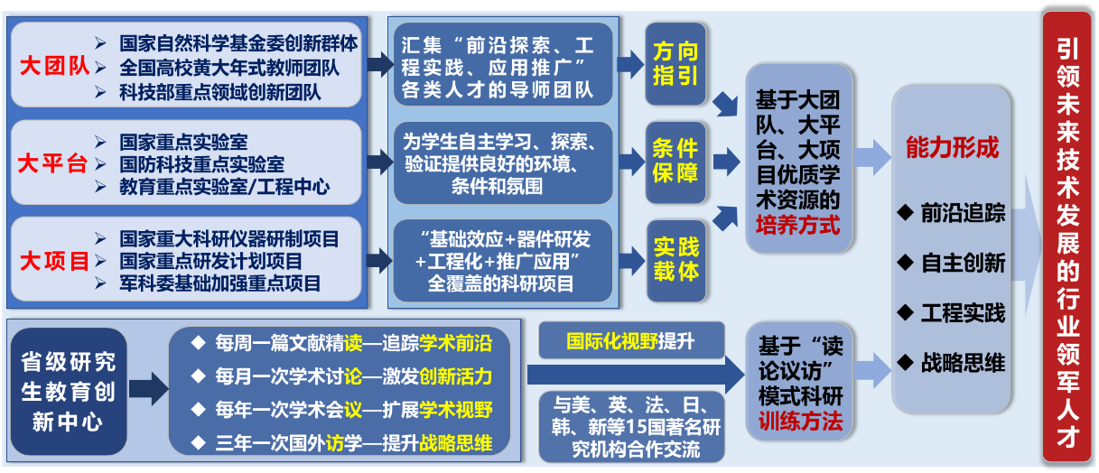 构建基于一流团队作方向指引、一流平台作条件保障、一流项目为实践载体的培养方式。利用大团队汇集各类人才导师优势,为学生科研训练提供全方位指引;利用大平台优质硬件条件,支撑学生自主完成理论学习和科研探索;利用大项目“基础效应+器件研发+推广应用”全覆盖的特点,使学生全员参与和全面感受项目解决全程。