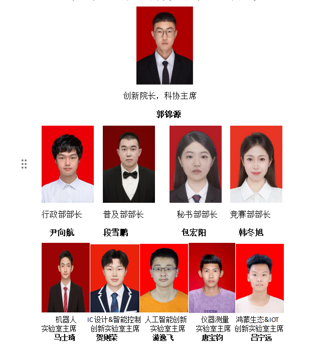 为了进一步提升创新精英研究院的实力与创新能力,使研究院统一化,我们创立了创新精英研究院创新精英小组,创新精英小组由以下同学担任: