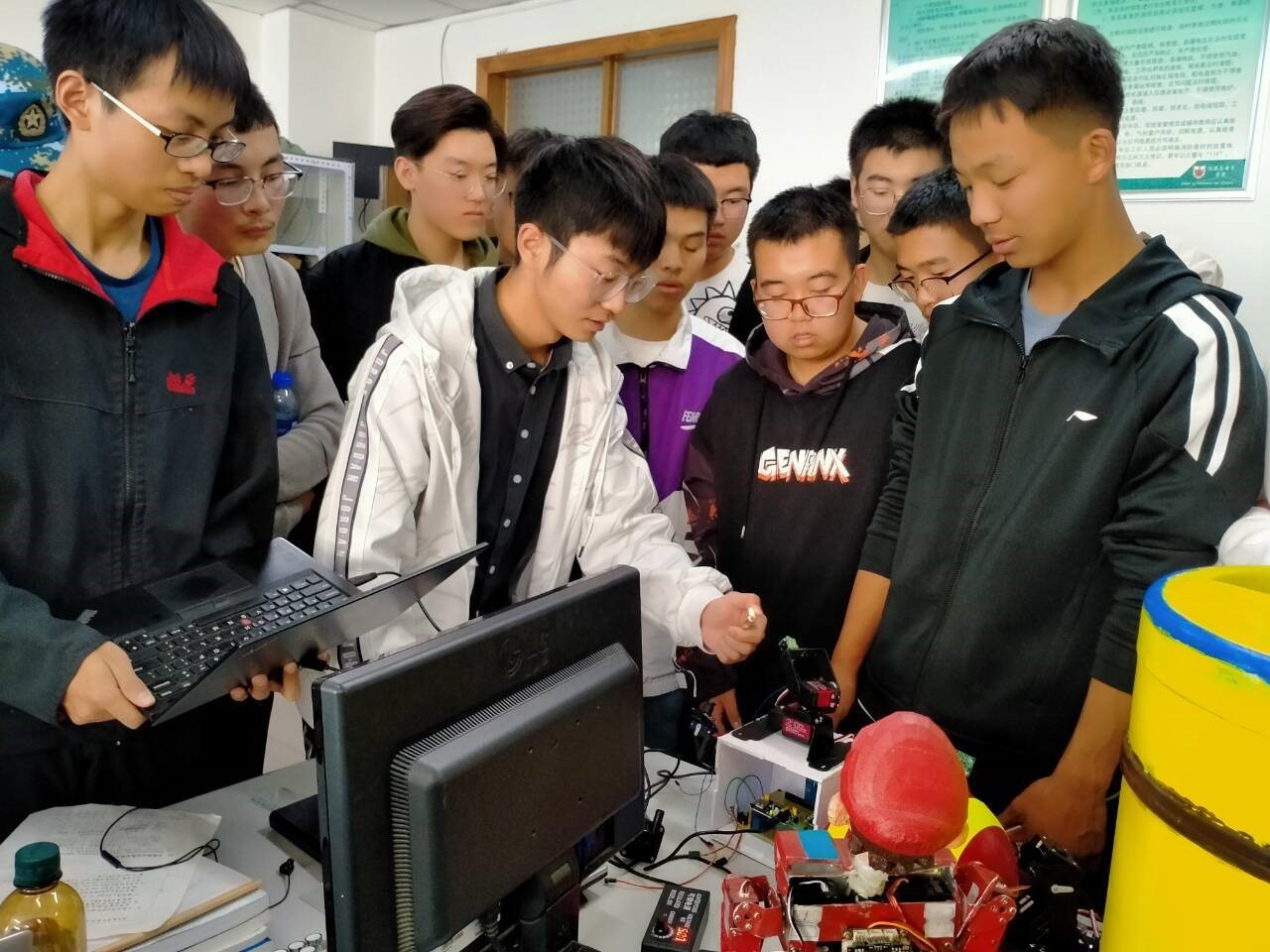 接下来各位学长学姐为20级新生们细致地介绍实验室的大致研究向与部分研究成果。大家对智能分拾垃圾桶,自动绘图机器人以及智能寻迹小车等科技产品十分感兴趣。