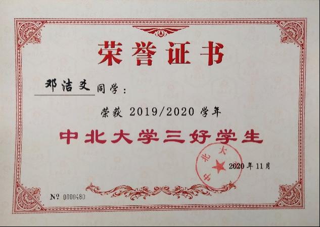 2020年11月,获2019/2020学年中北大学“三好学生”称号;