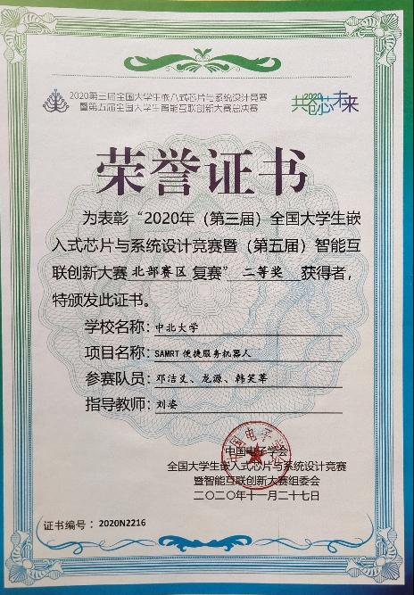 2020年11月,获2020年(第三届)全国大学生嵌入式芯片与系统设计竞赛暨(第五届)智能互联创新创业大赛北部赛区二等奖;