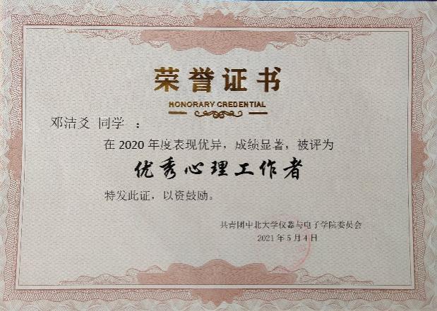 2021年5月,获中北大学仪器与电子学院2020/2021年度“优秀心理工作者”称号;