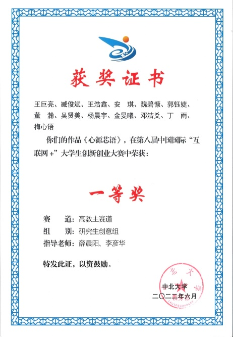 2022年8月,获“建行杯”第八届山西省“互联网+”大学生创新创业大赛金奖;