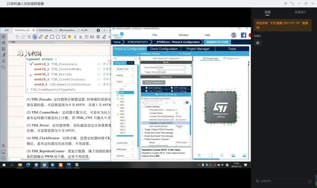 本次培训的主讲人为雷喜骏,主要内容为对stm32定时器(中断、PWM、输入捕获)的讲解。首先,雷喜骏通过框图的形式,对基本定时器、标准定时器、高级定时器进行讲解,使得同学们能够初步了解定时器的大体框架与基本原理。之后,雷喜骏为大家讲解定时器如何配置与注意事项,并着重讲解定时器配置的基本结构。最后,雷喜骏通过示例程序为大家演示如何配置结构体,使得同学们能够在实践中对定时器有更深的了解。