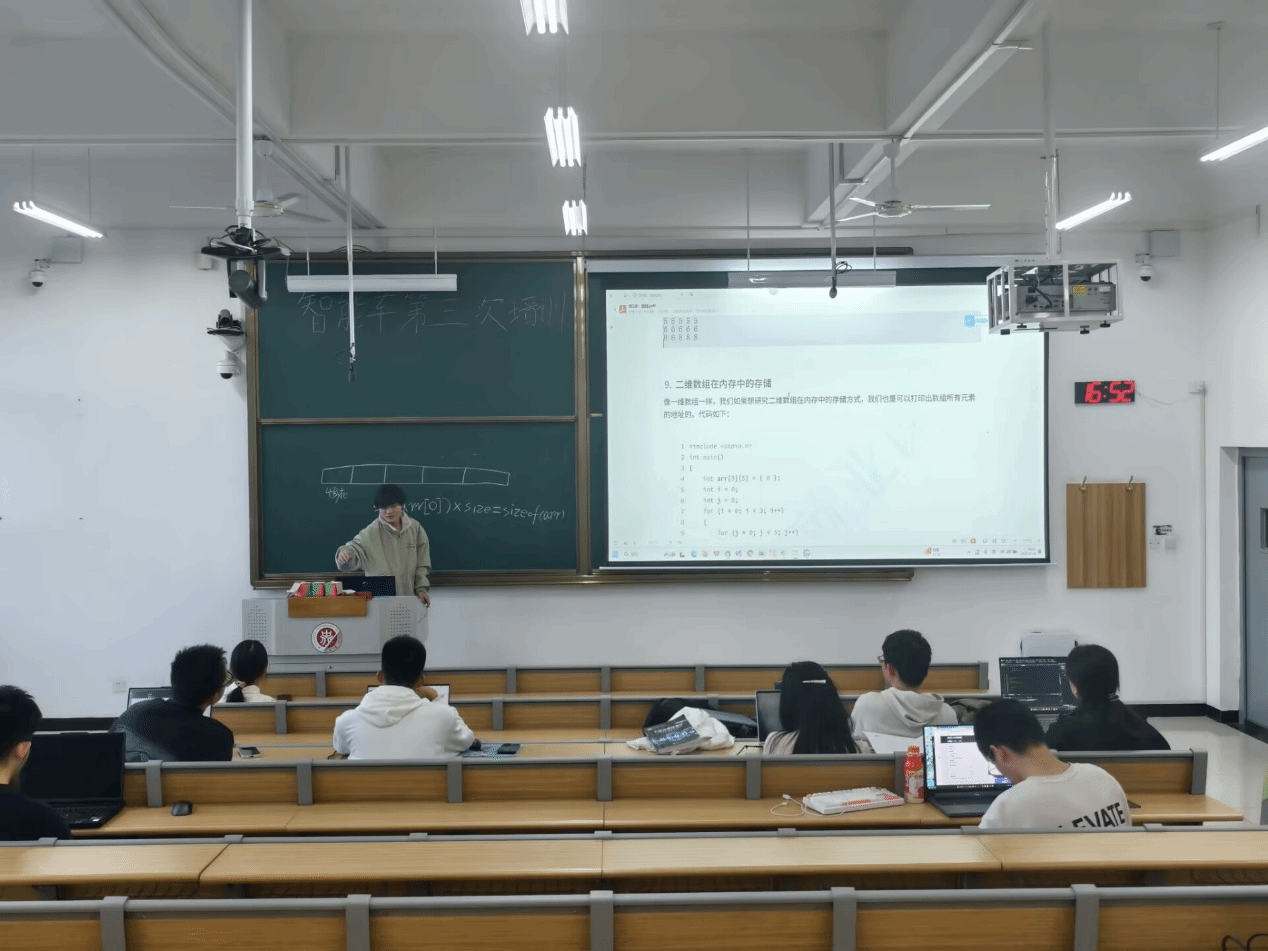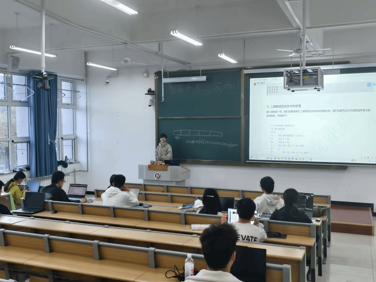 本次培训主要由战队副主席杨启航主持,25级的同学们参加了本次科普培训。杨启航向同学们系统讲解了C语言中数组的相关知识,包括一维数组与多维数组的定义与初始化、数组元素的访问与遍历方法,以及数组在实际编程中的常见应用场景与注意事项。在讲解过程中,他还结合典型例题,分析了数组在解决实际问题中的运用思路与技巧,帮助大家更好地理解数组的概念与用法。在理论讲解结束后,杨启航引导同学们动手编写了一些基于数组的基础程序,并逐一调试运行。初次接触数组编程,大家在实践中遇到了不少问题,杨启航利用课间时间耐心为大家答疑解惑,通过细致的辅导帮助同学们快速掌握了数组的核心知识点,并及时解决了大家在理解与操作上的困难,进一步激发了大家继续深入学习C语言的兴趣。培训最后,杨启航在洛谷团队中发布了有关数组的课后练习题,要求同学们完成后向各组组长汇报,由组长负责检查完成情况、监督学习进度,并协助解决后续学习中遇到的问题,从而有效巩固本次培训所学内容。