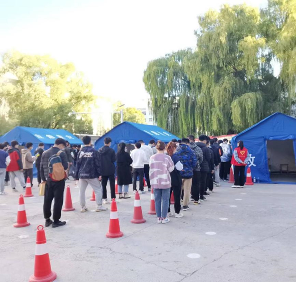 工作初期,志愿者通过网上报名的方式报名参与,并根据自身时间安排填写值班表,同时志愿工作采用轮换值班和通班两种值班形式来保证志愿者人数充足。核酸检测工作中,医务人员和志愿者各司其职,志愿者负责维持核酸检测的秩序,提醒学生佩戴口罩并打开核酸检测二维码,医务人员有条不紊地给同学们做核酸。志愿者的加入极大提高了核酸检测工作的速度与效率。