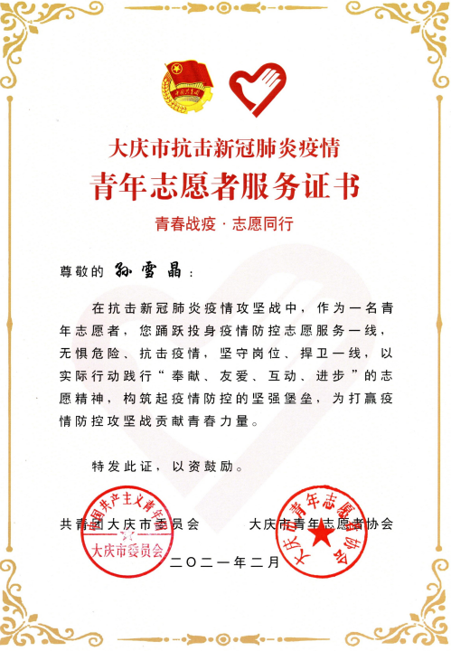在新冠肺炎疫情期间,作为大庆市新冠肺炎疫情青年志愿者和林甸县新冠肺炎疫情青年志愿者为家乡疫情防控贡献绵薄之力,作为志愿者代表被大庆市公共频道报道,所在志愿团队被中新网、黑龙江省法制频道、大庆晚报等报道。在山西遭遇连续降雨之后,通过山西省红十字会为暴雨洪灾捐款。