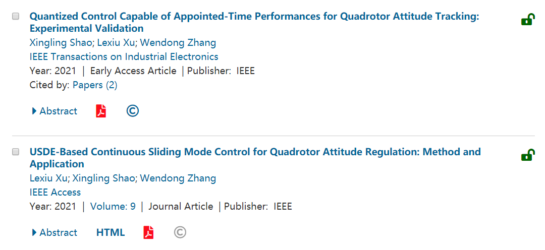 随着大三的回到学校,为了不留后患,我第一时间通过了英语六级。之后在课业更为繁重的同时,我也积极参与四旋翼无人机的硬件实验,但受限于前人经验较少的情况,实验平台各个方面的性能我要慢慢进行摸索。也就是在这段时间内,我通过阅读大量文献,与一线工程师积极沟通,最终成功将问题一一排除,成功在实验平台上成功进行了算法实现并且取得了理想可靠的结果。之后,我开始了第一篇文章的撰写,最终在寒假时完成了第一篇文章。拿给老师看之后,老师指出了许许多多问题,每次和老师交流后,老师前沿的思想、严谨的思维逻辑思路和对于细节的把握都是我惊叹,于是我在老师的不断指正下进行了文章的修改工作,也是在这个时候,我的逻辑分析能力、抗压能力和对时间的安排能力也有了明显的提升。有了第一篇论文写作带来的学习经验,我在第二篇论文撰写工作过程中主动避免了更多的错误,在老师更少的修改下,交出了一份更稳满意的成品,且该论文在一审时直接被录用,这一消息极大地增强了我的自信,同时也使我认识到科研工作不只是简单的做实验与分析,还是对于学习能力与表达能力的考验。