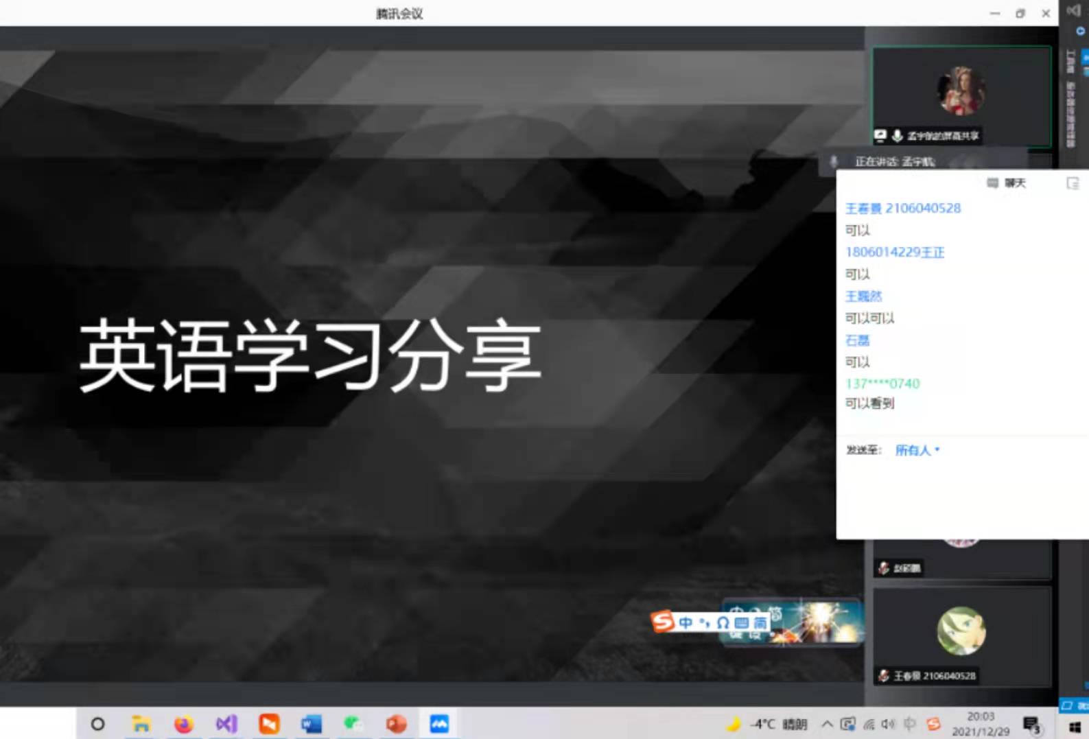 2021年12月29日,通过腾讯会议,组织同学就大学阶段如何学习英语,以及英语学习在今后的工作中的作用进行了交流。