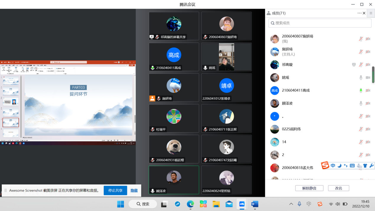 在提问互动环节,辅导员姚瑶首先询问了解了科研院所的工作内容及薪资情况。而后学生们纷纷提出了自己的问题:进入研究所的条件、研究生生涯的规划和建议、关于考博和从事科研工作的看法等,而顾泽凌校友也对同学们的问题进行了细致的解答。最后由学院副书记杜瑞平进行发言总结,杜书记指出知识改变命运,并希望每一个学子都能成为更好的自己。