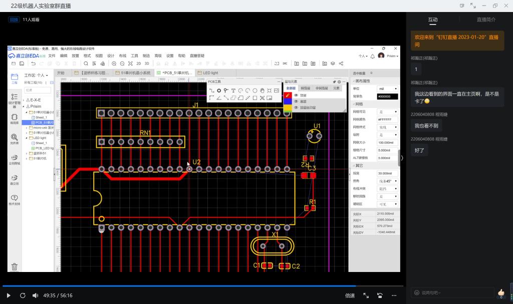 本次培训的主讲人为林瀚知,主要内容为对立创EDA软件与PCB的讲解。首先,林瀚知对立创EDA软件如何操作进行讲解,例如如何插入元件,如何编辑PCB布局等基础操作知识;然后,林瀚知从找寻所需原件、PCB生成到PCB布局与画线,以micro-USB点亮LED这一实例进行操作演示。之后,林瀚知以上学期学过的51单片机最小系统板为实例进行操作演示,重点演示如何选取所需元件,完成原理图后开始生成PCB,PCB板从布局到画线一气呵成,强调布局与画线的合理性与美观性。