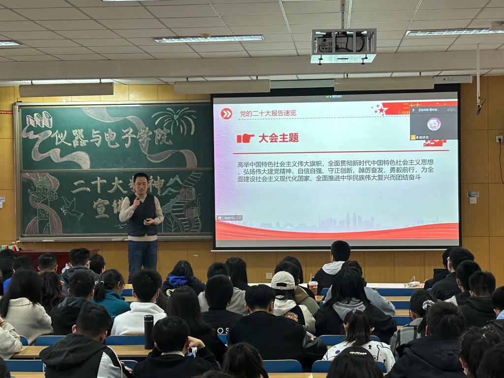 为深入学习贯彻党的二十大精神,2023年3月7日下午,党的二十大精神校内宣讲团成员、仪器与电子学院辅导员郭乐祥老师以《深学细悟党的二十大精神 踔厉奋发肩负青春使命》为题,在11508H教室,通过线上线下相结合的形式面向学院全体党员进行了宣讲。