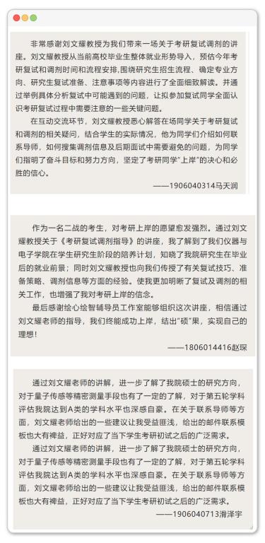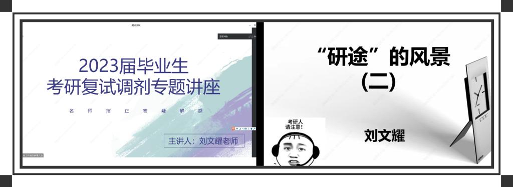 刘教授还从面试官角度为同学们详细介绍了考研复试的相关问题,使同学们对后续准备有了更清晰的目标和规划。工作室将继续邀请导师和校友对考研复试技巧和面试礼仪等方面进行分享,助力学生一战成硕,尽享“研途”的风景!