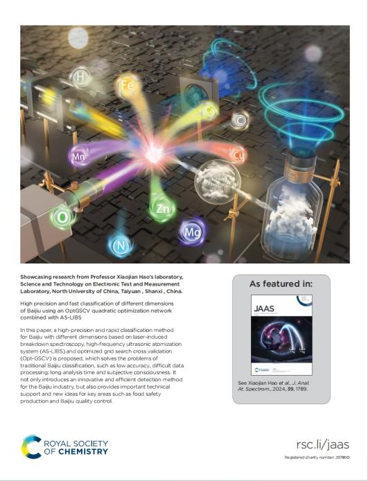在此之前,该团队2021级硕士研究生靳昊宇在郝晓剑教授的指导下,以“固液样品光谱增强及定性分选的LIBS光谱智能分析方法”为题展开研究,在激光诱导击穿光谱分析领域发表SCI/EI高水平论文7篇,其中第一作者身份在SCI光谱学1区期刊Journal of Analytical Atomic Spectrometry发表论文2篇(其中1篇被选为封面文章、1篇入选JAAS-2024-Hot Article并被选为封底文章)。