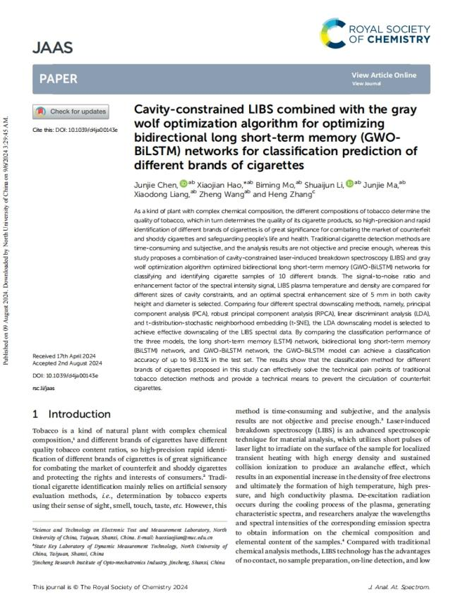 近日,我校仪器与电子学院郝晓剑教授“中仪迅辉”科技团队在激光诱导击穿光谱理论机理及应用分析领域取得重要进展,原创工作以“Cavity-constrained LIBS combined with the gray wolf optimization algorithm for optimizing bidirectional long short-term memory (GWO-BiLSTM) networks for classification prediction of different brands of cigarettes”为题,发表在国际著名期刊Journal of Analytical Atomic Spectrometry(IF=3.1,光谱学1区)上,并入选该期刊Back Cover(封底论文)。郝晓剑教授为论文通讯作者,硕士研究生陈浚杰为论文第一作者。该项研究获得了国家自然科学基金面上项目、山西省重点研发计划等多项资金的资助。