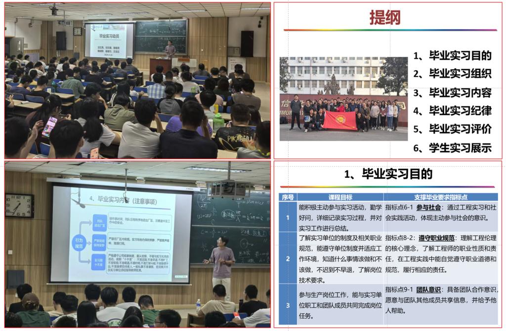 2024年9月18日,学院在9号教学楼102教室组织了毕业实习动员会,通过讲解实习目的和主要实习内容,强调实习过程中的纪律和安全问题,端正学生们的实习态度,激发实习积极性。毕业实习相关负责教师参与此次动员会。