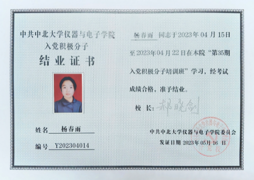 杨春雨,女,山西运城人,中共预备党员,仪器与电子学院测控技术与仪器专业21060143班学生。本人在校期间学习成绩优异,平均学分绩点4.29,排名专业第一,目前被推免至西安交通大学仪器科学与技术学院攻读硕士学位。曾获中北大学三好学生,优秀共青团员等称号,国家一等奖三项以及其他奖项若干。