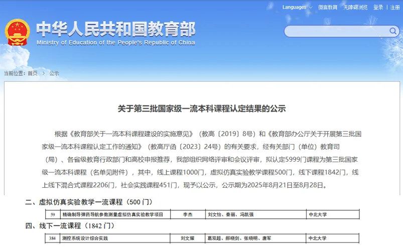 近日,教育部公布了《关于第三批国家级一流本科课程认定结果的公示》,学院李杰老师课程团队负责的《精确制导弹药导航参数测量虚拟仿真实验教学项目》课程入选虚拟仿真实验教学一流课程,刘文耀老师课程团队负责的《测控系统设计综合实践》课程入选线下一流课程。