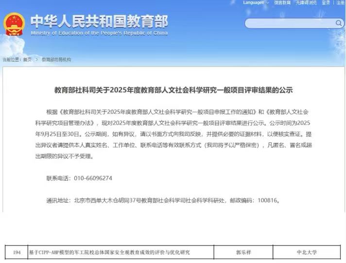 2025年9月25日,教育部社科司发布了《2025年度教育部人文社会科学研究一般项目评审结果的公示》。我院辅导员郭乐祥申报的项目《基于CIPP-AHP模型的军工院校总体国家安全观教育成效的评价与优化研究》获批高校辅导员研究项目立项,实现中北大学在该类别项目上的突破,成为我院党建、思政工作又一个新的标志性成果。