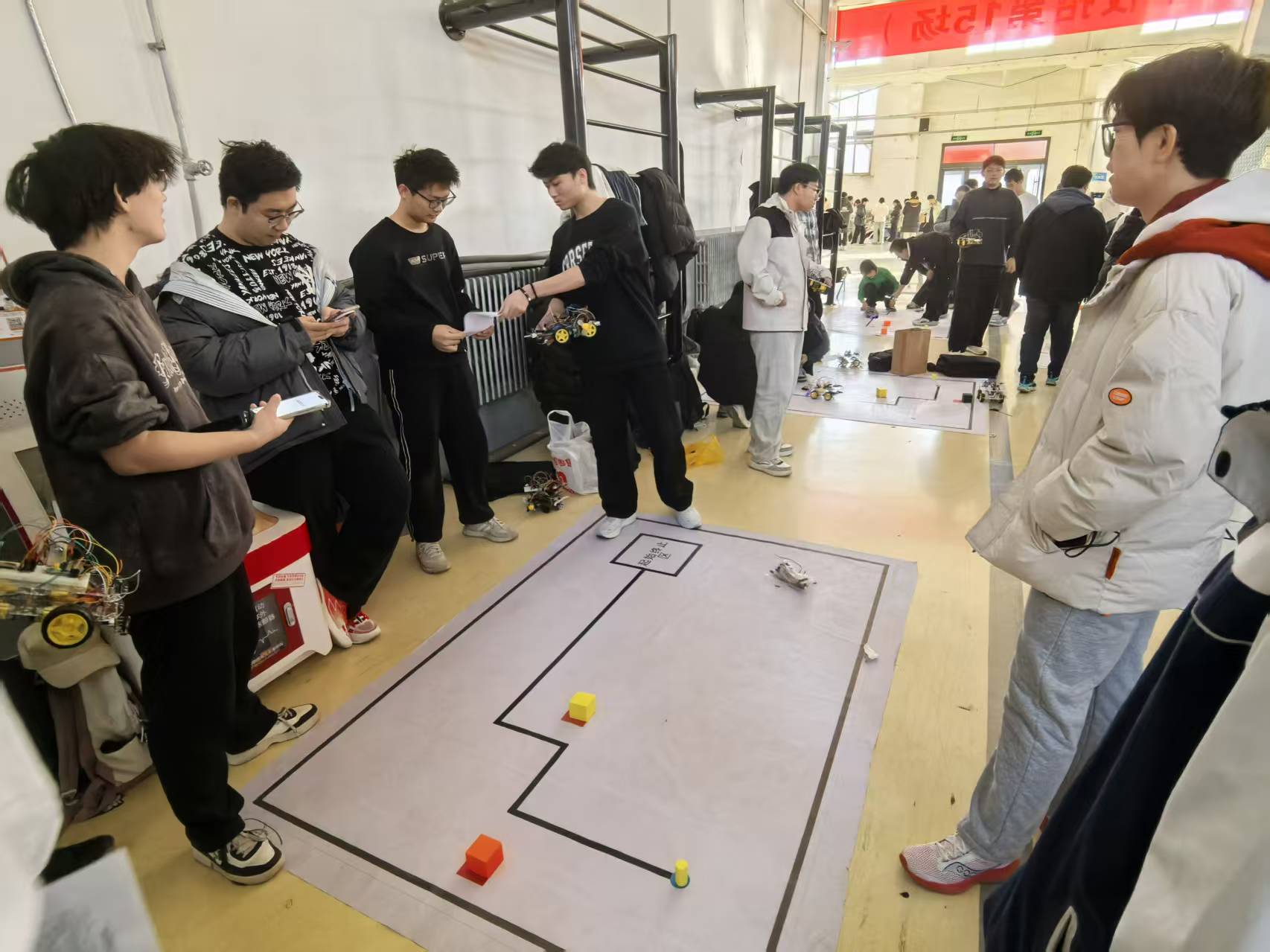 作为学院创新创业教育的重要载体,本次“启辰杯”大赛秉持“以赛促学、以赛促创”的核心宗旨,旨在锤炼大学生的工程设计、动手操作与问题解决能力,激发创新潜能,培养技术应用型人才。大赛以“火场物资抢救”为主题,要求参赛选手独立设计制作自动小车,完成从起点出发、穿越模拟火灾区域、精准夹取圆柱物资并原路返回放置的全流程任务。比赛设置基础任务与附加挑战,基础任务考察小车的路径规划与行驶稳定性,附加任务包含风扇对准火源吹风鸣笛、物资夹取放置、实验报告提交等内容,总分100分,以得分高低及完成时间作为排名依据,充分考验选手的综合技术素养与创新思维。