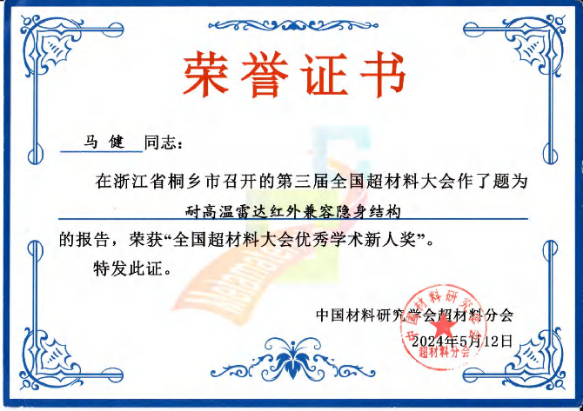 马健同学在张斌珍教授课题组老师们的培养下,依托课题组良好的学习科研氛围和先进的实验平台,围绕极端环境多光谱隐身技术开展创新研究,以负责人身份承担山西省研究生科研创新项目1项(已结题)。作为学生骨干参与多项国家级项目。目前以第一作者身份发表SCI学术论文3篇,以学生第一作者身份申请国内发明专利1项。多次参加学术会议并进行口头报告,其中在2024全国超材料大会做出口头报告《耐高温雷达红外兼容隐身结构》,分享了团队在极端环境下多光谱隐身技术的最新研究成果。