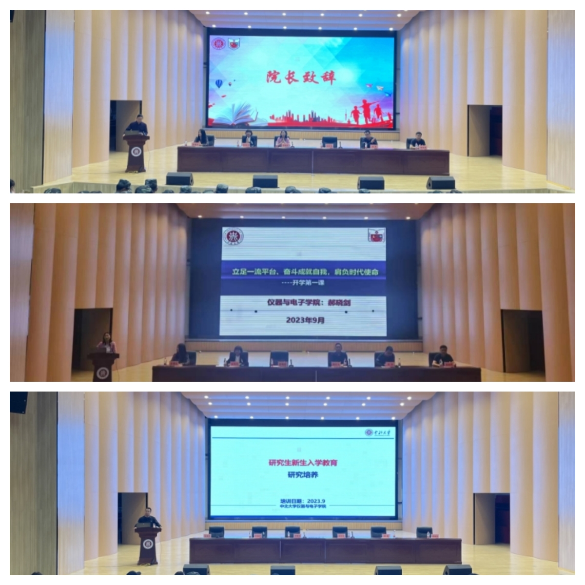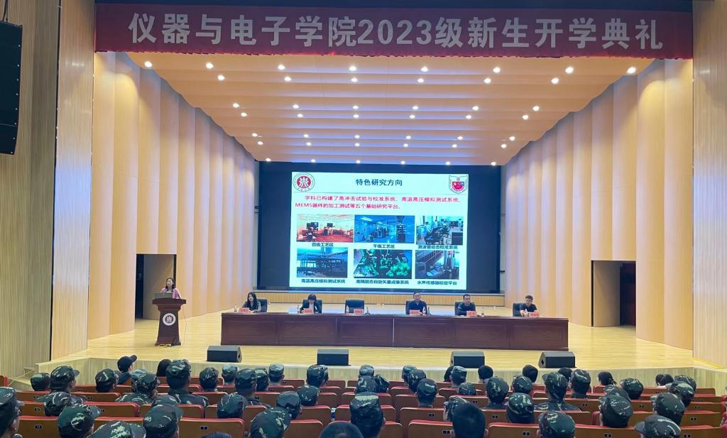 仪器与电子学院于9月20日在科艺苑举行了2023级新生开学典礼暨入学教育大会。仪器与电子学院党委书记郝晓剑、院长刘文怡及领导班子成员、各专业负责人以及全体2023级本硕博新生、班主任参加了此次会议。会议由学院党委副书记杜瑞平主持,并通过抖音面向广大家长、校友进行全程云端直播。