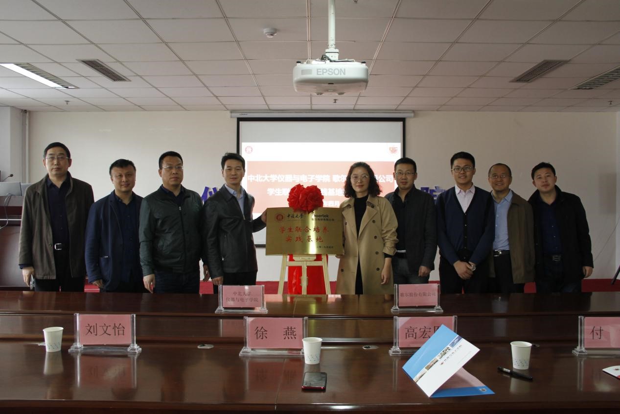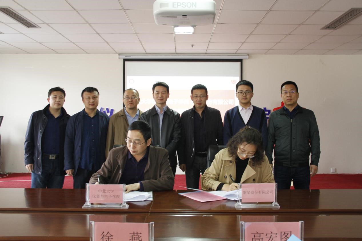 4月19日上午,中北大学仪器与电子学院与歌尔股份有限公司签订学生联合培养实践基地合作协议并揭牌。仪器与电子学院副院长刘文怡、党委副书记高宏图、副院长李杰、歌尔股份有限公司传感器事业部研发总监付博、高校合作部部长徐燕、高校合作经理张德华等出席会议。
