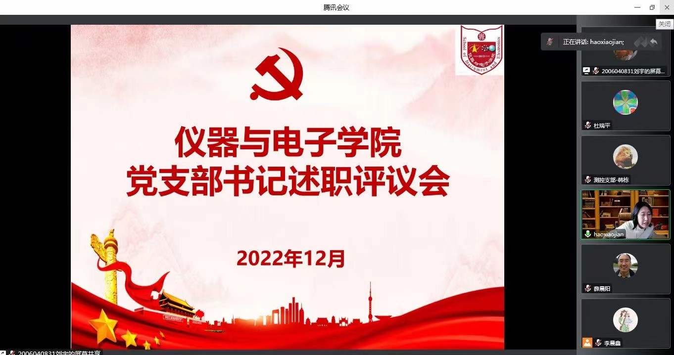 为进一步加强党的全面领导,压实党建主体责任,提高党建工作质量,仪器与电子学院党委积极贯彻落实学校党委工作部署,于12月31日通过腾讯会议召开了2022年度党支部书记述职评议会。学院党委书记郝晓剑主持会议,学院党委委员、党员领导干部和各支部书记参加会议。会议采取现场述职与书面述职相结合的方式进行。