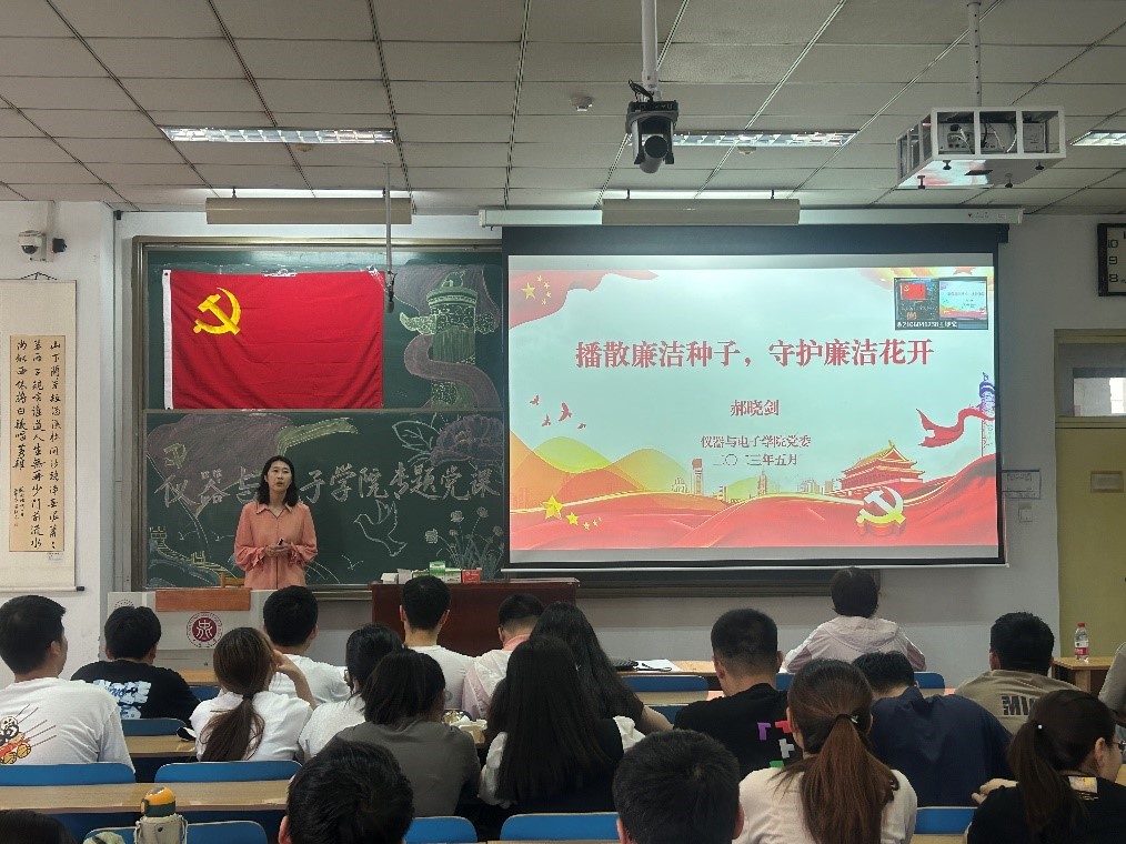 为深入学习习近平新时代中国特色社会主义思想,引导学院师生树牢廉洁思维、严守廉洁底线,2023年5月19日下午,仪器与电子学院党委书记郝晓剑教授以《播散廉洁种子,守护廉洁花开》为题,并邀请了马克思主义学院院长赵笑蕾教授参会宣讲。在11305H教室,通过线上线下相结合的形式,为学院理论学习中心组成员、领导班子成员、研二支部师生党员和发展对象、入党积极分子等作了形势报告,讲授了专题党课。