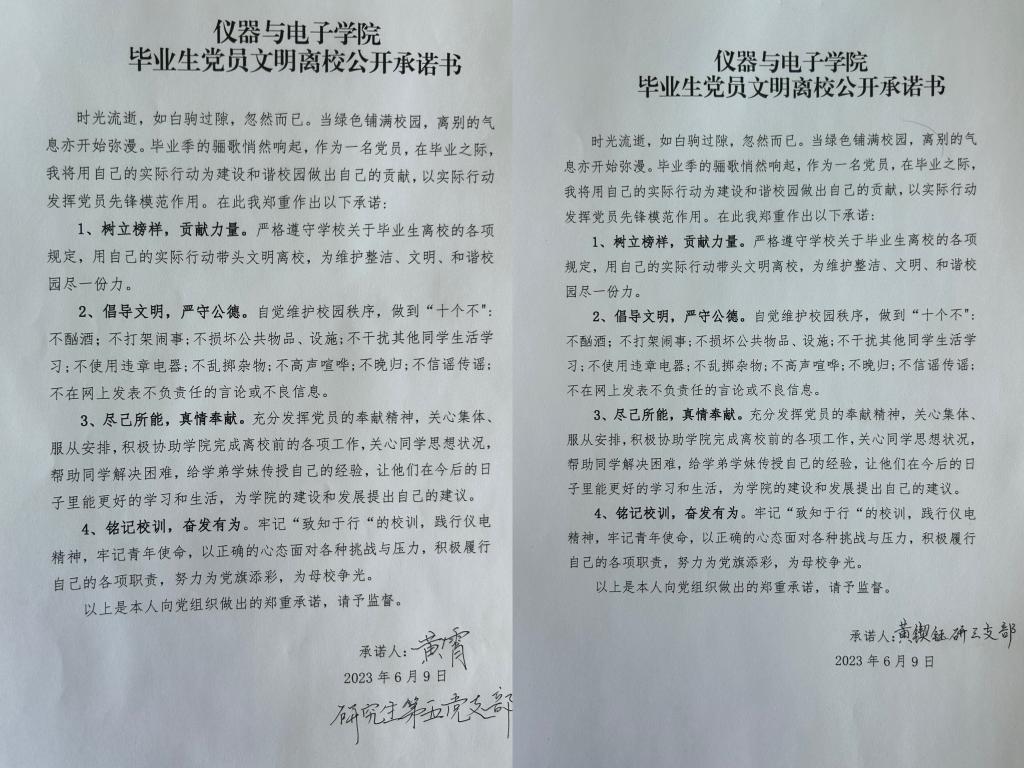 活动第三项,学院党委面向全体毕业生党员发出倡议,在毕业季这样一个关键阶段,希望大家积极展现共产党员的精神风貌,在文明离校过程中充分发挥模范带头作用,引领广大毕业生遵守校纪校规,感恩母校,规范言行,做文明离校的宣传员和践行者,所有党员同学在现场郑重签署了《仪器与电子学院毕业生党员文明离校公开承诺书》。