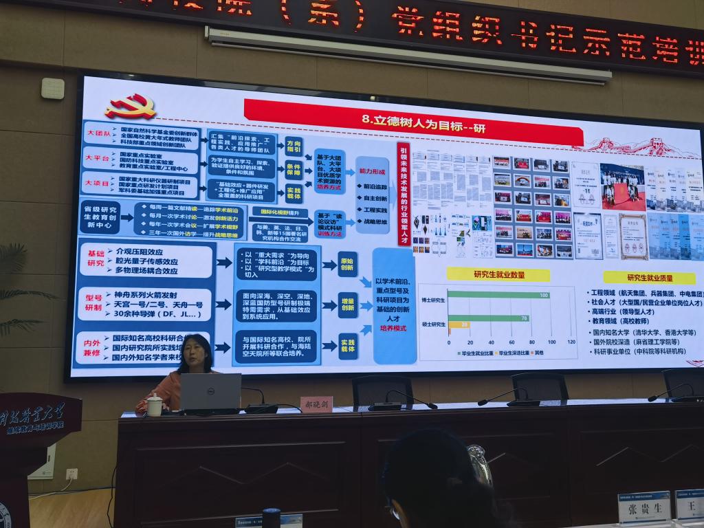 郝晓剑以《党建红引领仪电蓝 “一融双高”促发展》为题,对学院标杆院系建设和党建工作情况进行了分享。她从学院厚植红色土壤,强化政治功能,确保党组织领导和运行机制到位;筑牢红色防线,压实政治责任,确保政治把关作用到位;高擎红色旗帜,提升政治引领,确保思想政治工作到位;建强红色堡垒,激发组织活力,确保基层组织制度执行到位;以党建红引领仪电蓝,确保党建工作与事业发展融合到位等方面就学院标杆院系工作思路、建设路径、工作成效同与会人员进行了交流。
