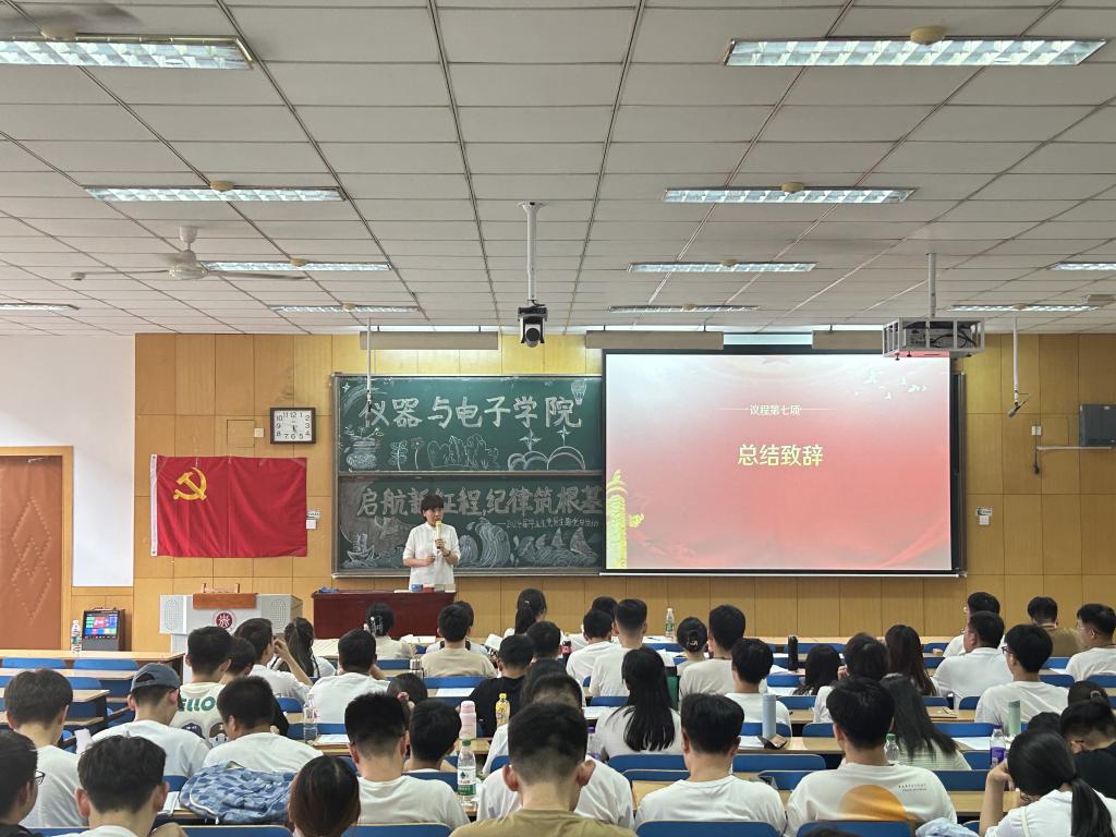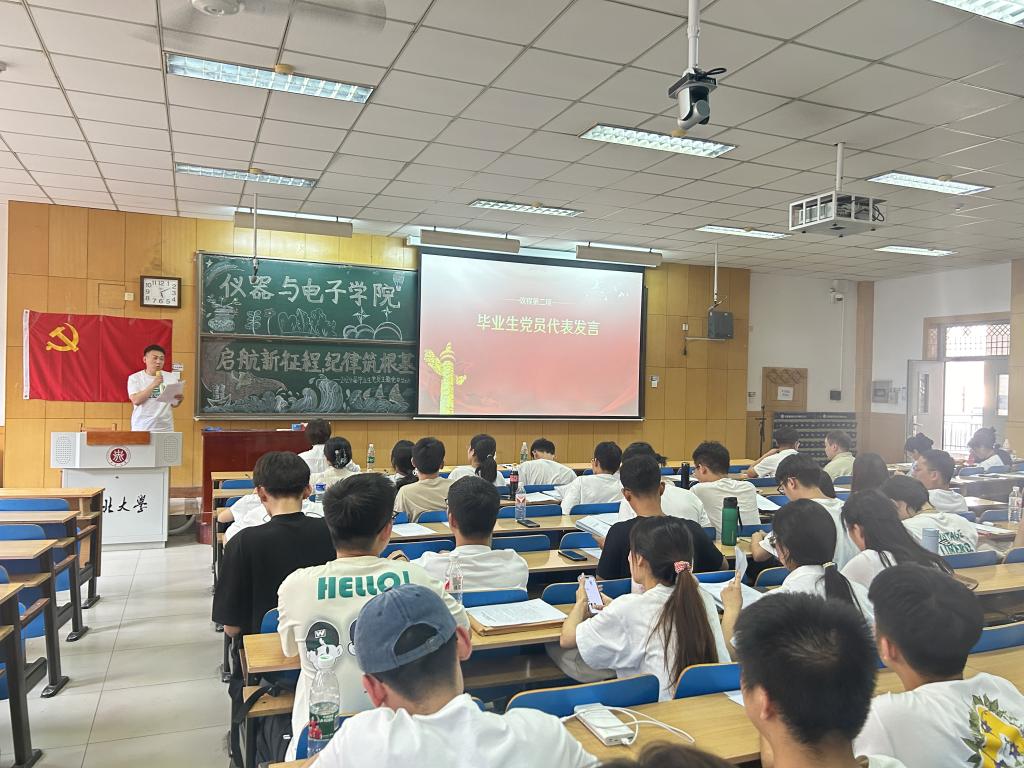 为深入开展党纪学习教育活动,鼓励和引导毕业生党员系好人生第一粒扣子,行稳致远走好人生道路,仪器与电子学院于6月18日下午,在11208H教室举办了“扬帆启征程 纪律筑根基”——2024届毕业生党员主题党日活动。学院全体毕业生党员齐聚一堂,庄重而热烈地度过在校期间最后一次党日活动。
