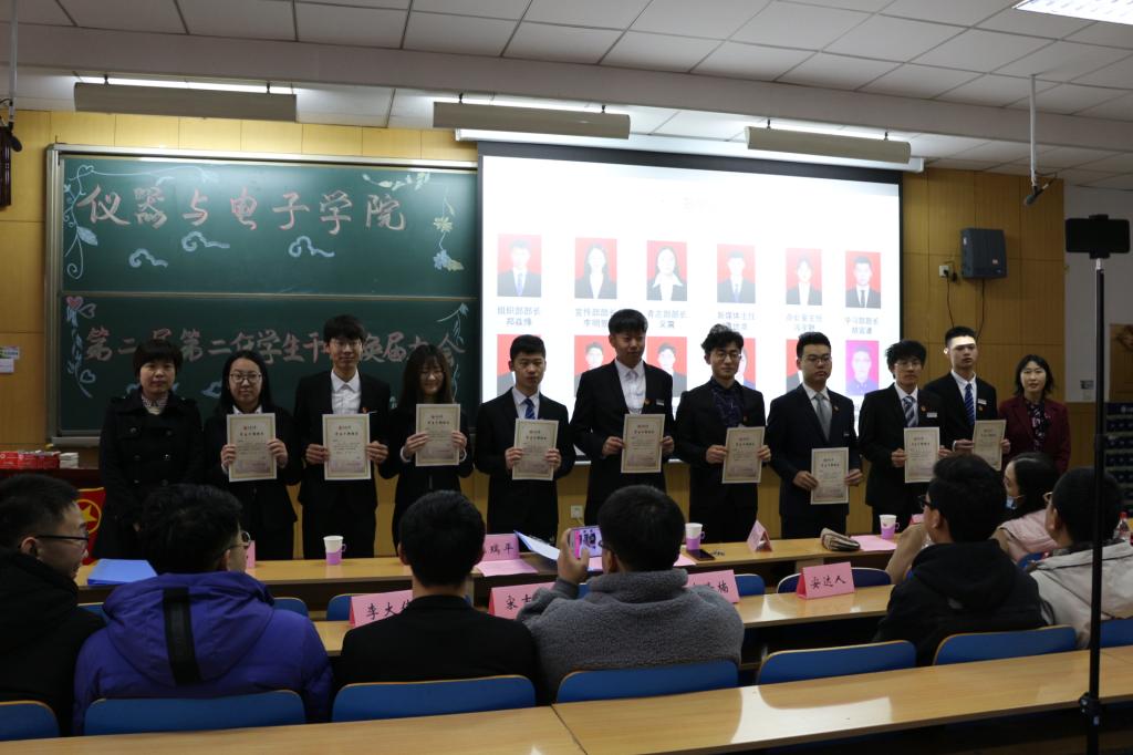 活动伴随着庄严的中国共青团团歌开始,仪器与电子学院第二届第一任团委副书记刘孝春同学做上学年工作总结,表达了对新一届团委学生会成员的殷切期望。院团委书记荆伟伟宣读新一届团委学生会干部名单,并由院党委书记郝晓剑、院党委副书记杜瑞平为新任学生干部们颁发聘书。