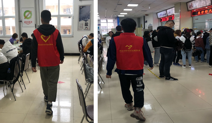 活动期间,志愿者负责维持餐厅的排队秩序,提醒同学们在取餐和乘坐电梯时间隔排队,保持一定的距离;在就餐前后配戴好口罩。就餐时间段餐厅人流量大,排队时间长,对于志愿者来说,让所有人做到间隔排队是一项有挑战性的工作。但每一位志愿者在活动中恪尽职守,毫不懈怠,耐心提醒取餐和排队的同学,维持餐厅秩序,在餐厅用餐人数最多的时间段圆满完成任务。