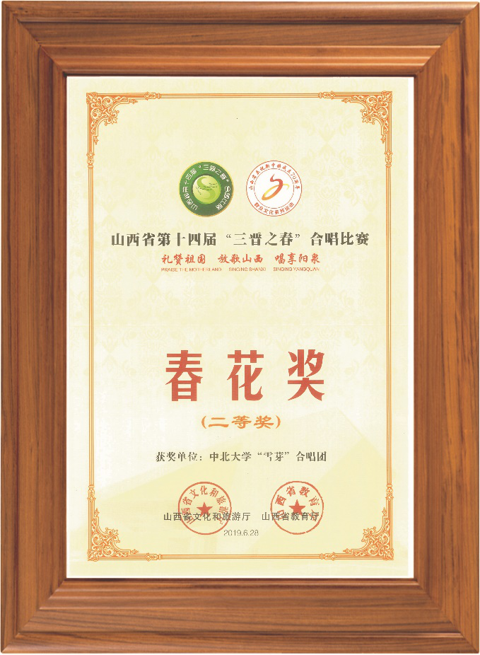 近日,山西省教育厅、山西省文化和旅游厅给仪器与电子学院雪芽合唱团颁发山西省第十四届“三晋之春”合唱比赛“春花奖”(省级二等奖)。2019年6月,雪芽合唱团赴山西省阳泉市参加山西省第十四届“三晋之春”合唱比赛,该合唱团是所有高校参赛队伍中唯一一支非专业团队。