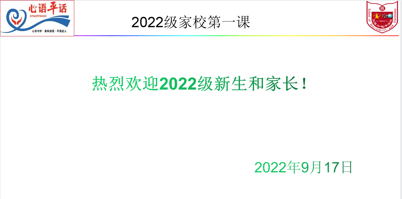 2022年9月17日晚7时,仪器与电子学院通过线上会议的形式举行2022级新生家校第一课。本次会议由“心语平话”辅导员工作室组织,在新生入校前面向2022级新生及家长召开。会议由工作室负责人、仪器与电子学院党委副书记杜瑞平主持。