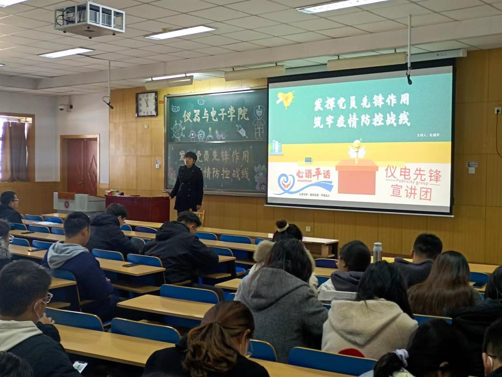 2022年11月14日,心语平话辅导员工作室面向仪器与电子学院400余名本硕博党员进行了“以案示警 争做先锋”的主题教育活动。以案示警,学生党员们从情景剧中深刻认识到疫情就在身边,党员要主动站在防控的第一线,发挥先锋作用。