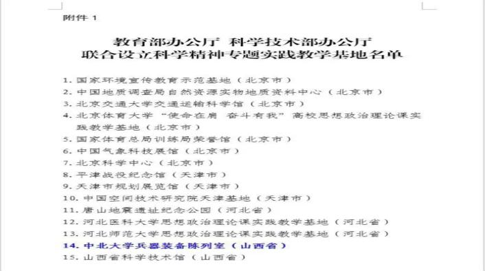 2022年8月23日,教育部公布首批“大思政课”实践教学基地,共有453个基地获批建设。中北大学“兵器装备陈列室”成为教育部和科学技术部联合设立的“科学精神专题实践教学基地”。中北大学为山西省唯一入选该专题实践教学基地的高校。