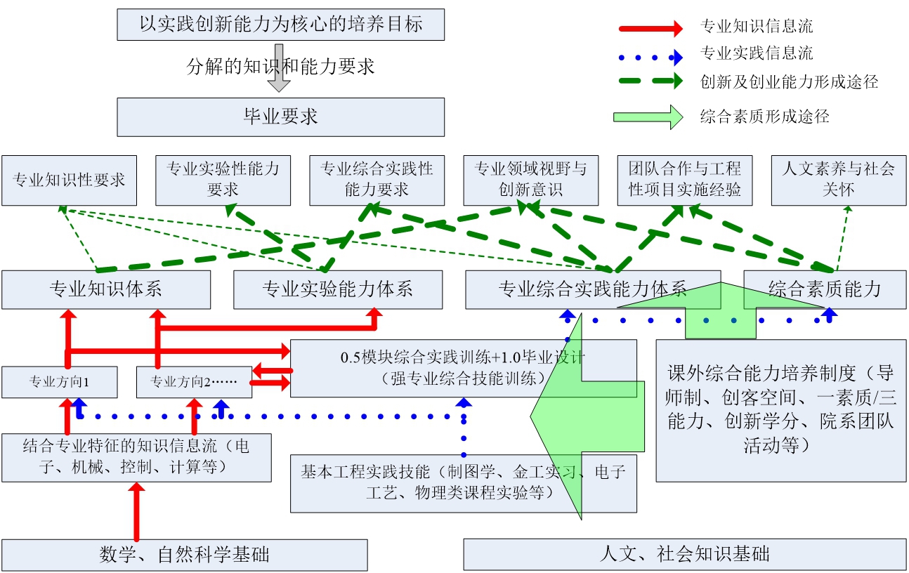 学院建立了以强化学生实践创新能力为导向的人才培养模式,目的是通过优化整个培养体系,从理论、实验、综合实践实训、毕业设计和课外实践创新等实践环节协同强化学生实践动手能力和创新意识。其实施过程是通过对整个课程体系的优化设计,科学合理设置和安排课程知识点和前后衔接关系,拔冗留精,在2.5学年的时间内完成所有基础课程和大部分专业知识点的学习,随后0.5学年将多门课程设计融合为以问题为导向的贯穿一个学期的课程群综合实践,最后是将毕业设计扩展为以项目为导向的1年期毕业设计。期间以“创新精英研究院”为平台,同步贯穿课外创新创业实践活动,对更多学有余力的同学加以指导培养。